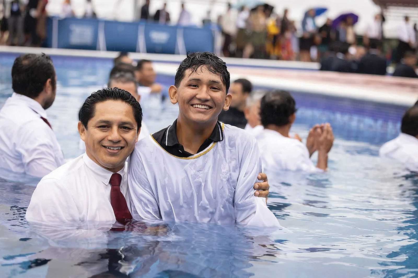 A young church elder smiles after baptizing a young Pathfinder. Photo: Daniel Gallardo